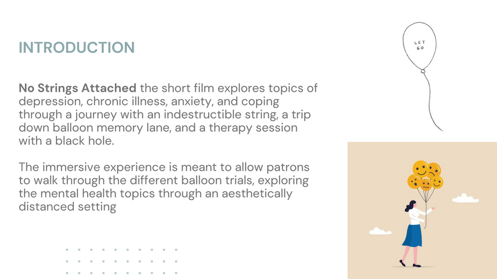 The experience will be set up as a series of rooms along a long hallway. Each room will be themed around a specific color, topic, and scene from the film, No Strings Attached. The rooms will have plaques on the wall exploring the scientific research behind each scene and detailing resources that correspond to the mental health topic being explored.